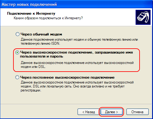 7. Выбираем 2 пункт «Через высокоскоростное подключение, запрашивающее имя пользователя и пароль», «Далее»