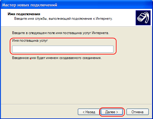 8. В поле «Имя поставщика услуг» вводим «Интерра» (либо что-то другое, это просто название ярлыка), «Далее»