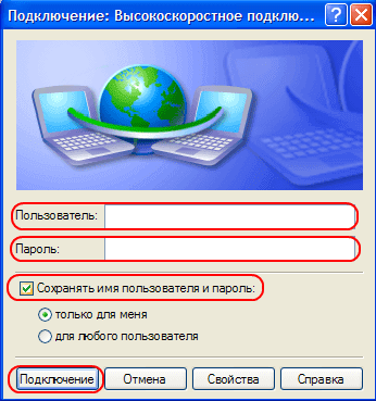 6. Вводим имя пользователя(логин) и пароль, ставим галочку «Сохранять имя пользователя и пароль», нажимаем «Подключение».