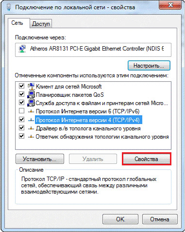 7. Во вкладке «Общие» выделите пункт «Протокол Интернета версии 4 (TCP/IPv4)», и нажмите кнопку «Свойства».