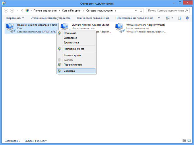 3. Откроется окно “Сетевые подключения”. На ярлыке «Подключение по локальной сети» — нажмите правой кнопкой мыши. В открывшемся меню выберите «Свойства»