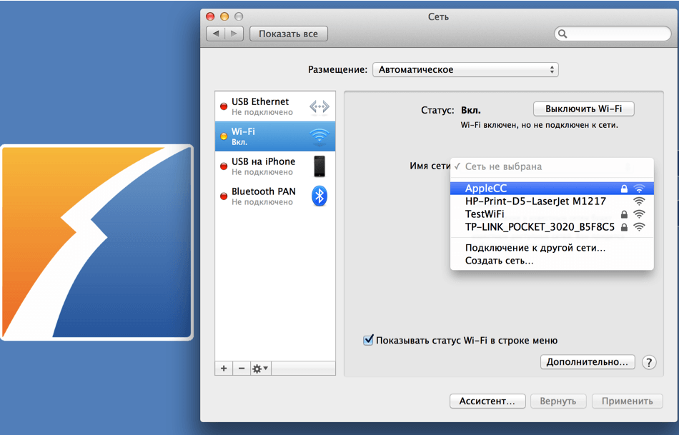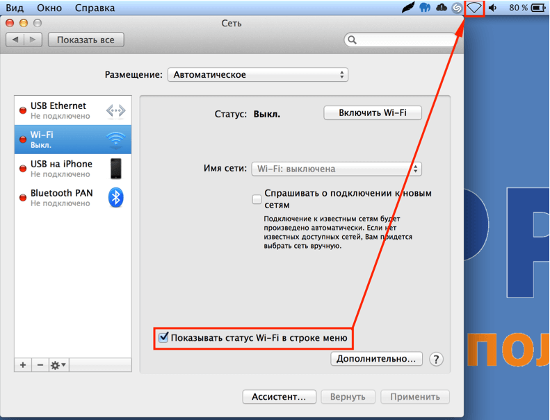 Если «Показывать статус Wi-Fi в строке меню» не активно, то нажимаем на саму надпись левой кнопкой мыши.