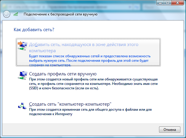 5. В открывшемся окне «Подключение беспроводной сети вручную» выберите пункт «Добавить сеть, находящуюся в зоне действия этого компьютера»