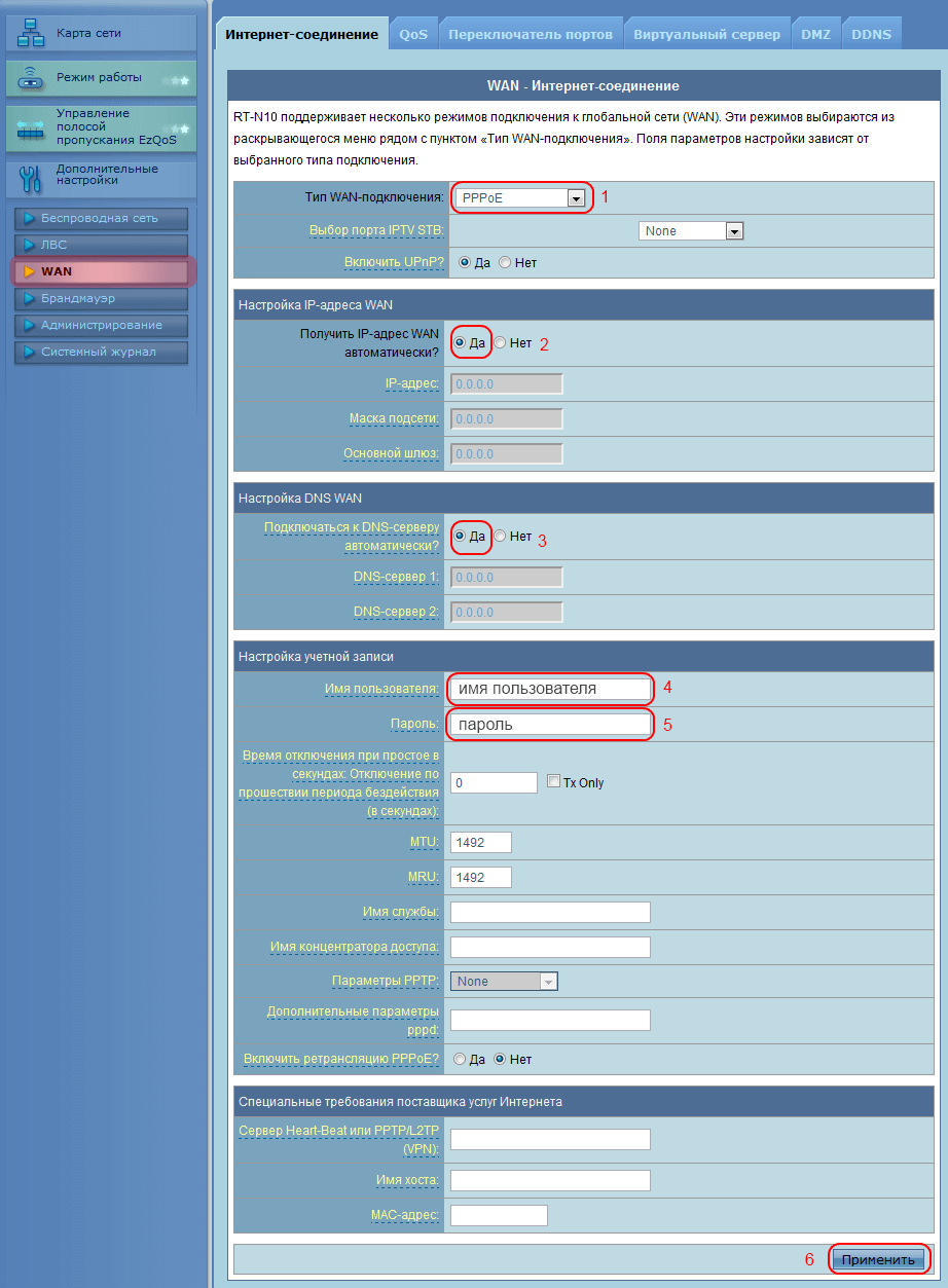 далее слева выбираем строчку «WAN» и начинаем настраивать подключение к интернету, делаем так как на рисунке ниже, выбираем тип подключения PPPoE, IP и DNS адрес - автоматически. Вводим логин и пароль от интернета