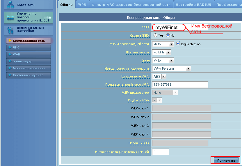 Теперь остается настроить Wi-Fi соединение, с левой стороны выбираем пункт «Беспроводная сеть» и делаем как на рисунке ниже. Имя беспроводной сети (SSID) можно указать своё. Предварительный ключ WPA делаем тоже свой (не менее 8 символов).