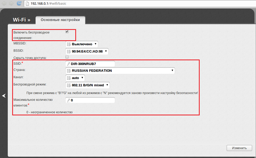 Теперь приступаем к настройке Wi-Fi. Находим и выбираем вкладку Wi-Fi (ранее мы уже выбирали «Сеть») → Начнем с вкладки «Основные настройки», в строке SSID вводим название (допустимы латинские буквы и цифры), это название будет демонстрироваться при поиске беспроводных сетей. Далее нажимаем Изменить и Сохранить в появившемся сверху окошке (но если вы настраивали уже по подключившейся Wi-Fi сети, подключение к ней у вас пропадет, т.к. название сети вы изменили, необходимо будет подключится заново)