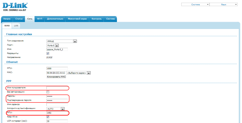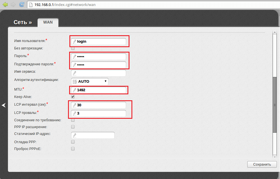 Следующий этап, один из главных в котором мы настраиваем само соединение с интернетом, страница разбита на несколько групп элементов: Главные настройки, Ethernet и PPP. В главных настройках нам нужно выбрать «тип соединения» выбираем PPPoE. В Еthernet ничего трогать не нужно. Осталось только PPP, где мы должны ввести свои данные (логин и пароль от интернета), галочку «без авторизации» ставить не нужно. В поле MTU вписываем 1450. Если вы всё сделали правильно то в нижней части окна нажимаем Сохранить.