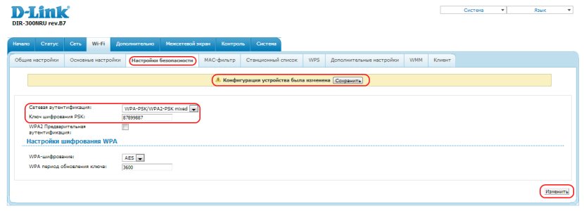 Открываем вкладку «Настройки безопасности», и изменяем сетевую аутентификацию с OPEN на WPA-PSK/WPA2-PSK mixed, в строке ключ шифрование вводим ключ безопасности сети (пароль от Wi-Fi сети) не менее 8-ми символов. Нажимаем Изменить и Сохранить в появившемся сверху окошке (если вы настраивали роутер по Wi-Fi сети, подключение вновь разорвется, нужно будет ввести тот 8-ми значный номер для подключения к Wi-Fi сети, который вы только, что вводили в поле «ключ шифрования»).