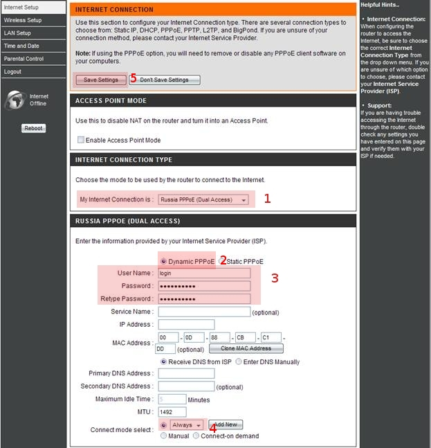 4. Connect mode select - режим установки соединения. На рисунке выбрано «Always-on» для постоянного подключения. «Connect-on-Demand» - установка соединения при необходимости - то есть при появлении трафика, направленного в Интернет, устройство установит соединение, а при отсутствии активности более времени, указанного в «Maximum Idle Time» - отсоединиться. В случае выбора «Manual» - соединение устанавливается и завершается вручную.