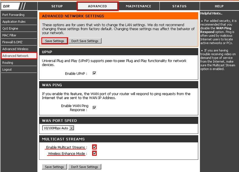 Зайти в ADVANCED - Advanced Network и поставить галочки Enable Multicast Steams и Wireless Enchante Mode. После чего Save Settings