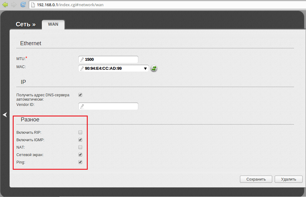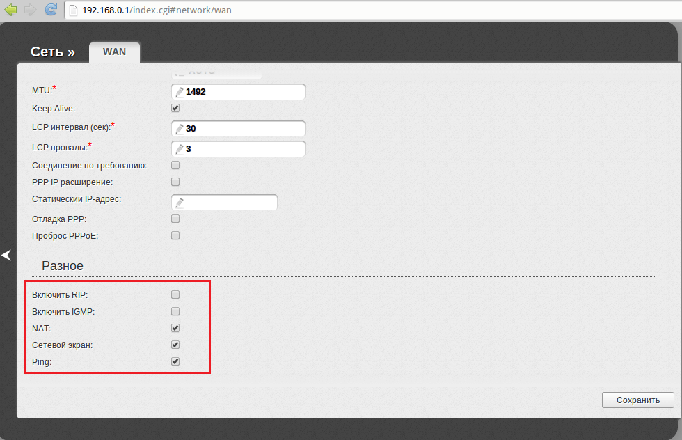 Получаем меню настроек этого подключения, менять там следует только галочки в категории Разное (параметр NAT используется для IPTV, если IPTV не работает — включите NAT, если всё работает без него — не меняйте этот параметр), после чего нажимаем сохранить
