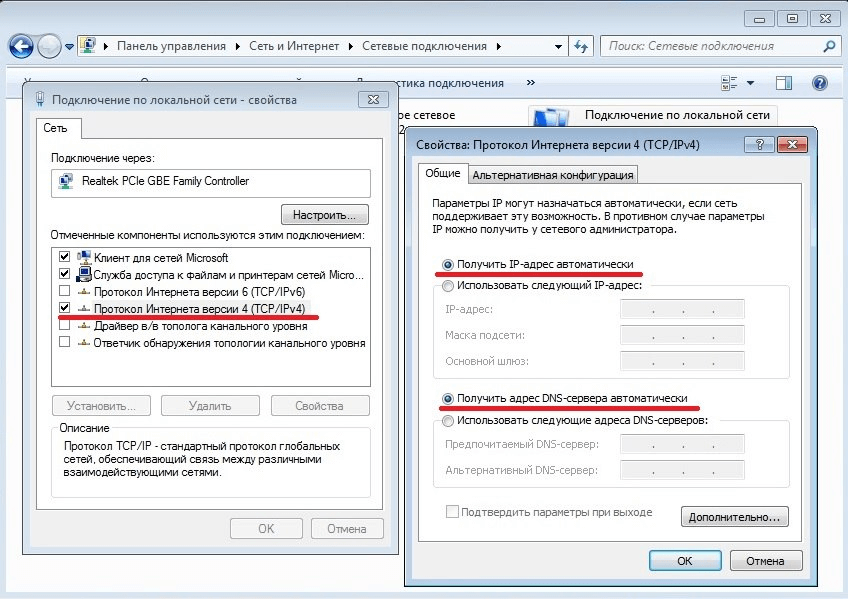В случае, если это не помогло, нужно проверить, получаются ли оборудованием настройки автоматически. Для этого заходим в «Сетевые подключения» в «Панели управления». Выбираем «Подключения по локальной сети» и его «Свойства».