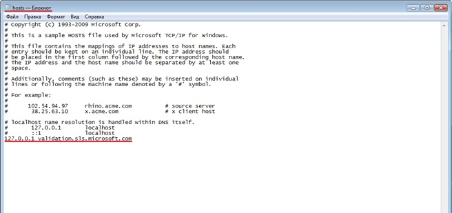 Под символом # написаны закомментированные строчки, т.е. они не исполняемые. В данном примере мы видим, что работает только строка 127.0.0.1 validation.sls.microsoft.com. Посторонних записей в данном файле быть не должно, если есть, то удаляем их и сохраняем.