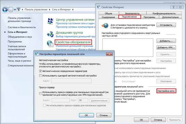 Заходим Пуск → Панель управления → Сеть и Интернет → Свойства обозревателя → вкладка подключения → настройка сети и проверяем не стоит ли галочка на «использовать прокси-сервер»