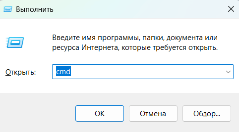 В результате этих действий у нас появится окно, в котором пишем cmd и нажимаем «Enter» либо «Ок»