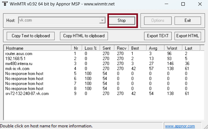 В верхней части программы вписываем узел, до которого необходимо провести проверку. Для примера будет vk.com.