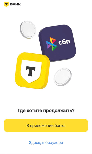 4. Если приложения на телефоне отсутствует, то вас перенаправит на страницу банка. Показано на примере Т-Банк. Выберите «Остаться в браузере» и войдите в онлайн банк с помощью мобильного номера телефона. Далее подтвердите операцию списания средств.